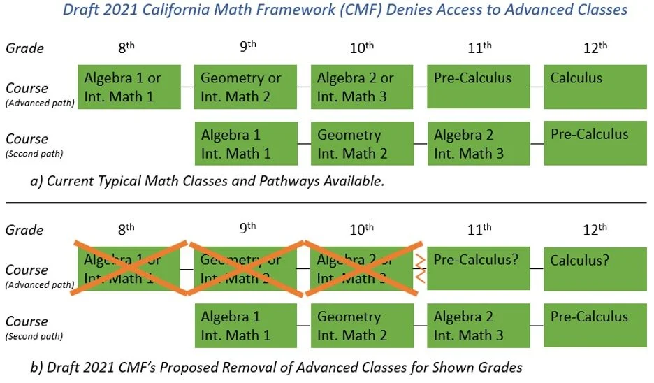 It is these classes, Algebra 1 or Integrated Math 1 in 8 th grade, Geometry or Integrated Math 2 in 9 th grade, and Algebra 2 or Integrated Math 3 in 10 th grade, which the draft framework is recommending taking away from students in those grades, as shown by the cross-outs in Fig 1 (b). These are called advanced classes because they are taken in a lower grade than a second pathway that is present in the school system (see Fig. 1). Roughly 1 out of 4 students in the U.S. take Algebra in 8th grade, so this potentially affects a tremendous number of students. Denying access to advanced classes compromises students because “there is also powerful research showing that among academic factors, the strongest predictor of whether a student will earn a bachelor’s degree is the highest level of mathematics taken in high school.”