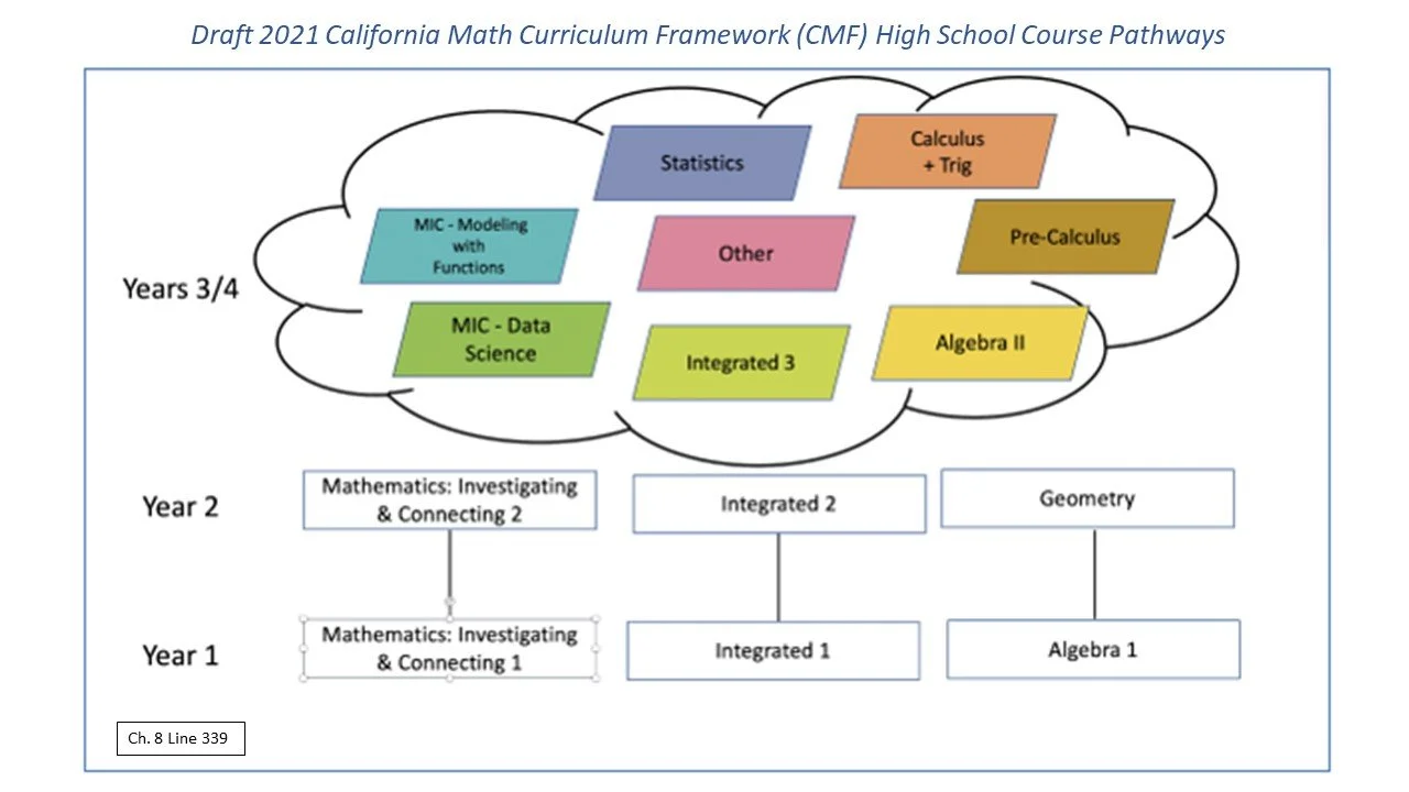 In stark contrast to this, the high school course sequence recommended by the draft framework is shown below (Ch. 8, line 339):