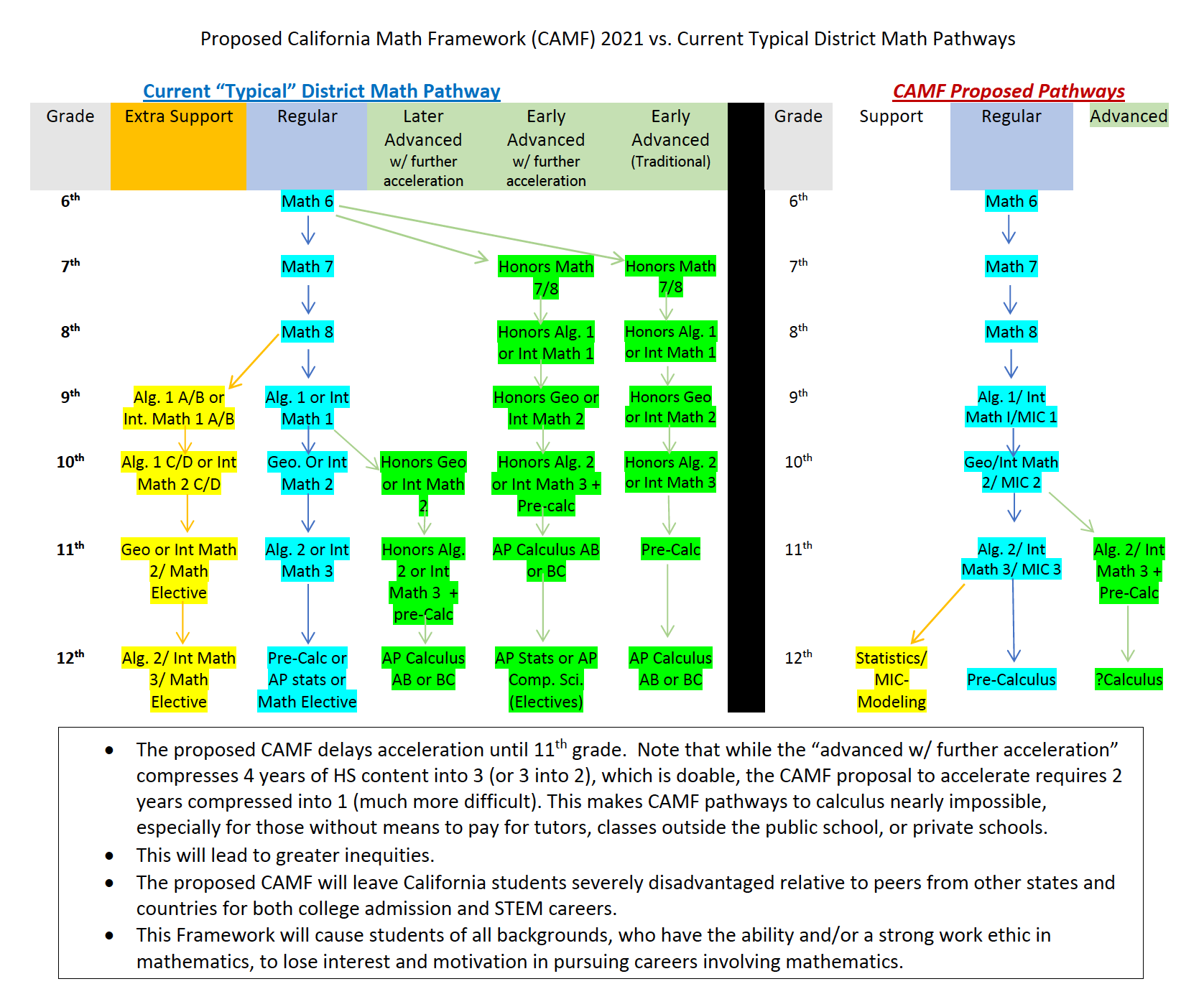 As can be seen, pathways covering students who need extra support all the way to students prepared for acceleration at multiple grades are available. Parents must ask themselves, “which option would they prefer for their child?” The single option proposed by the draft 2021 CMF on the right or the one with multiple options that flex to meet the needs of differing students at different points in their math education.